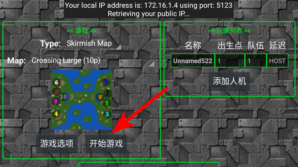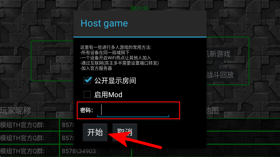 3、在彈出的Host game界面中,可根據(jù)需求設置密碼,設置完成后點擊開始,完成房間創(chuàng)建。