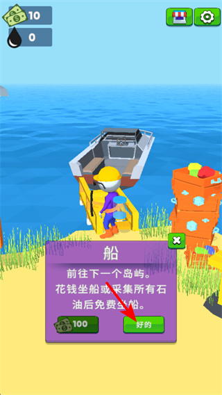 1、在船只界面,點擊好的按鈕,可選擇花錢坐船或采集所有石油后免費坐船,探索區(qū)域關(guān)鍵操作,能開啟島嶼進程。