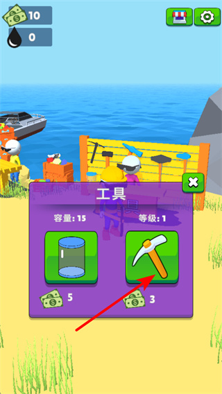 2、在工具界面,點擊鎬子圖標,可花費3金幣解鎖或升級鎬子工具,提升采礦效率,為資源收集和游戲發(fā)展提供助力。
