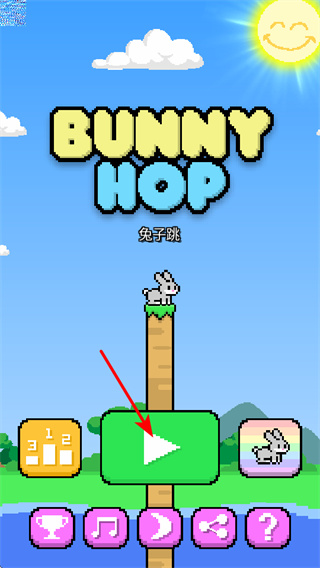 1、進入游戲界面后,點擊綠色開始按鈕,可開啟兔子跳的跳躍冒險,這是進入游戲的關(guān)鍵操作,點擊能展開兔子的跳躍挑戰(zhàn)。