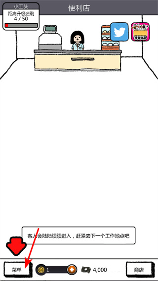 4、在便利店操作完成后,點擊左下角菜單按鈕,可查看游戲功能、任務(wù)或進行場景切換,準確點擊才能規(guī)劃后續(xù)游戲進程。