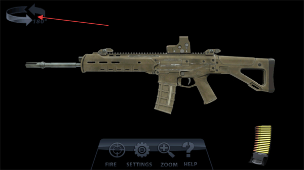 1、進(jìn)入游戲后可以在槍架上選擇喜歡的槍支進(jìn)行體驗(yàn),點(diǎn)擊左上角的按鈕,可以180度翻轉(zhuǎn)槍械進(jìn)行觀察。
