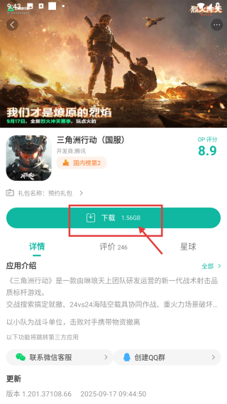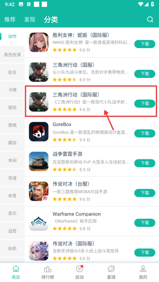3、在動作分類游戲列表頁面,選擇三角洲行動國服游戲,進(jìn)入游戲詳情頁面。