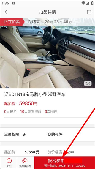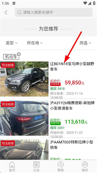 3、在機動車拍賣列表頁,點擊寶馬小型客車,進入拍品詳情頁。