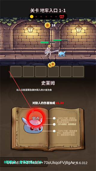 3、點(diǎn)擊下方書本上的弱點(diǎn)可以幫助勇者更快速的解決掉史萊姆。