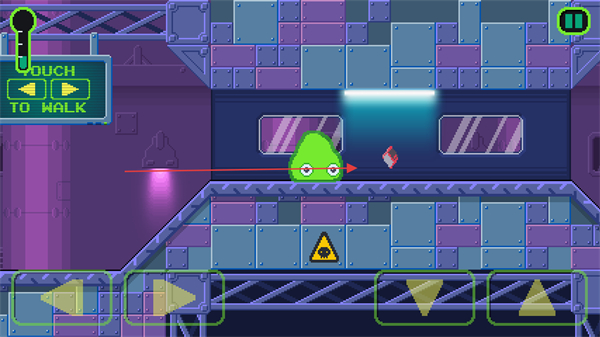 3、點(diǎn)擊跳躍按鈕,讓粘液角色跳躍過(guò)障礙,同時(shí)可觸發(fā)TOBECOMESTICK功能,附著在墻面移動(dòng)。