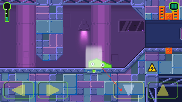 4、利用向下按鈕控制角色下落,進(jìn)入新區(qū)域,繼續(xù)探索并收集物品,推進(jìn)粘液實(shí)驗(yàn)室的進(jìn)程。