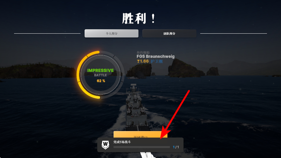 4、戰(zhàn)斗勝利后關(guān)注任務(wù)進(jìn)度條,完成如完成1場戰(zhàn)斗的任務(wù)可獲取獎勵,完成后可用于升級艦艇或解鎖新武器。