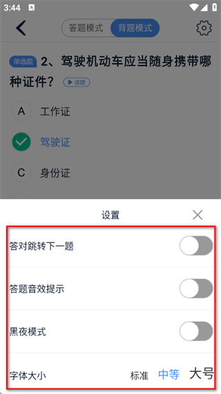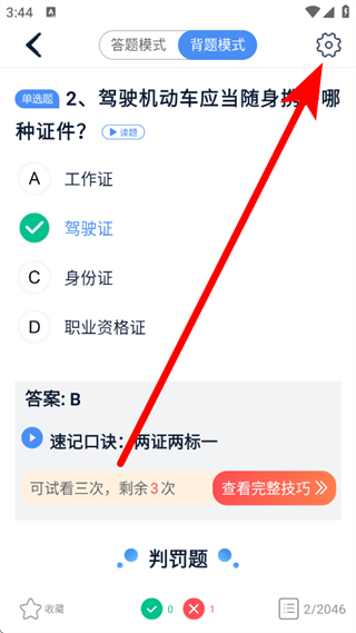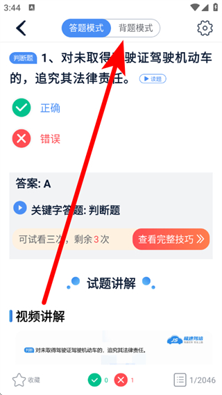 2、在答題模式頁面,點擊切換到背題模式,進入背題模式頁面。