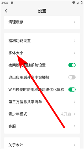 3、在設(shè)置頁(yè)面,點(diǎn)擊字體大小,進(jìn)入字體大小設(shè)置頁(yè)面。