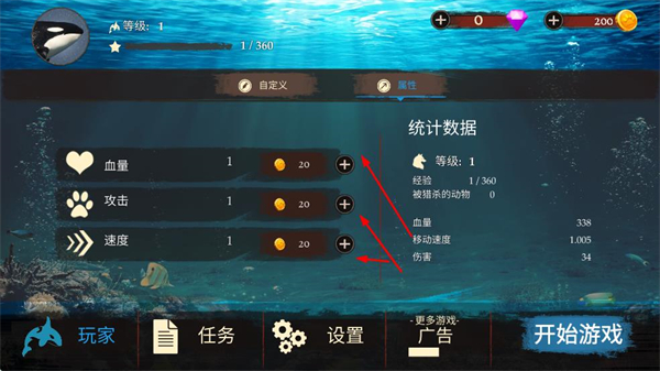 1、升級角色屬性,消耗金幣提升角色戰(zhàn)斗與生存能力,為游戲探索與戰(zhàn)斗做準備。