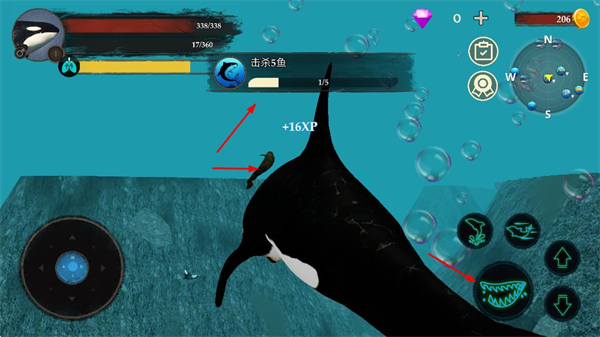 2、操控海洋生物在海域中移動,探索不同區(qū)域,尋找獵物與任務目標。