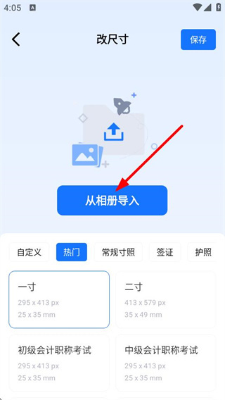 2、在改尺寸頁面點(diǎn)擊從相冊導(dǎo)入,選擇需要修改尺寸的圖片。