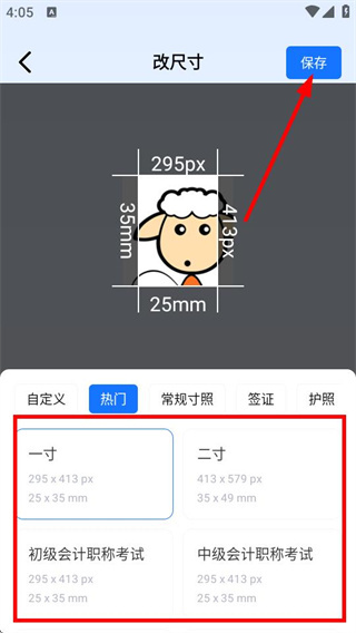 3、選擇目標(biāo)尺寸如一寸后點(diǎn)擊保存,完成圖片尺寸修改。