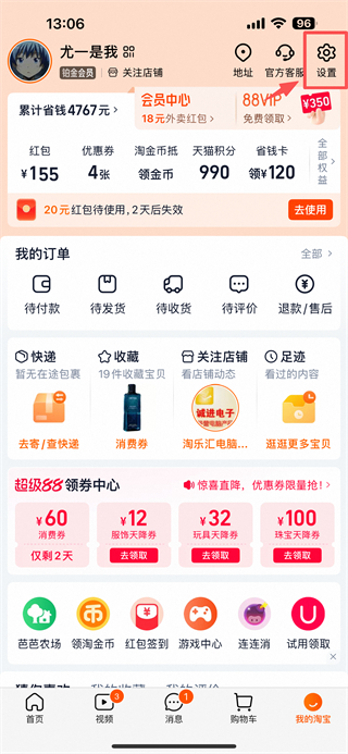 2、在個人中心頁面,點擊右上角設(shè)置圖標(biāo),進(jìn)入設(shè)置界面。