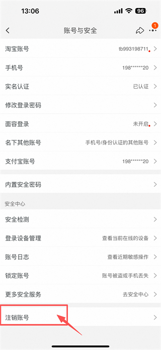 4、在賬號與安全頁面,點擊注銷賬號選項,進(jìn)行淘寶賬號的注銷操作。