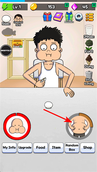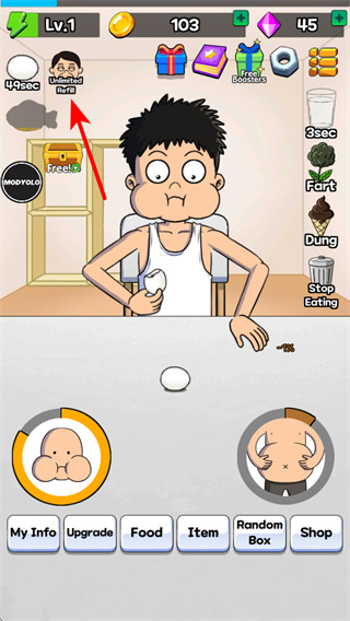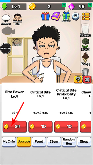 1、點擊Upgrade界面的升級選項,消耗金幣提升進食能力,這是解鎖新食物的基礎(chǔ)操作,提升核心屬性。