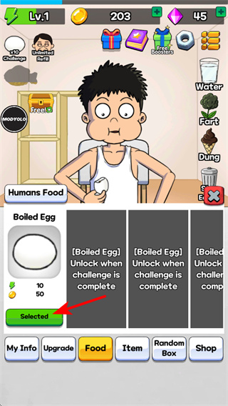4、進入Food界面,選擇已解鎖的食物并點擊Selected,可讓角色進食,積累進度將助力解鎖更多新食物。
