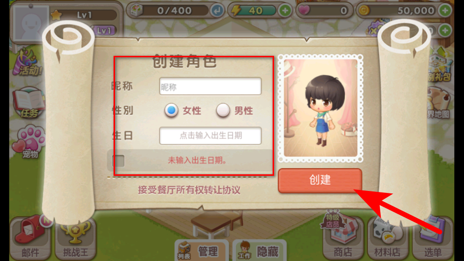 1、進入萌萌餐廳游戲,在創(chuàng)建角色界面填寫昵稱、選擇性別、輸入出生日期后,點擊創(chuàng)建按鈕,創(chuàng)建游戲角色。