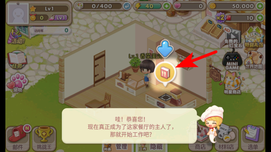 2、角色創(chuàng)建完成后,在餐廳界面點擊帶有書本圖標的引導(dǎo)區(qū)域,開始餐廳經(jīng)營的初始操作。