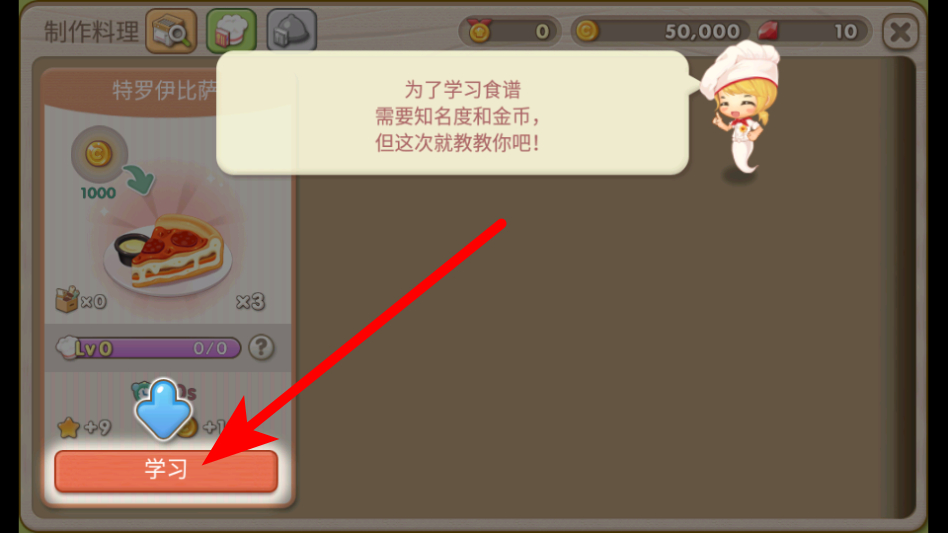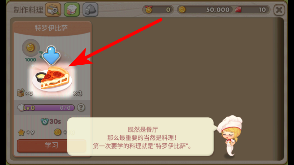 4、在料理學(xué)習界面,點擊學(xué)習按鈕,開始學(xué)習特羅伊比薩的制作食譜,開啟餐廳料理制作的經(jīng)營環(huán)節(jié)。