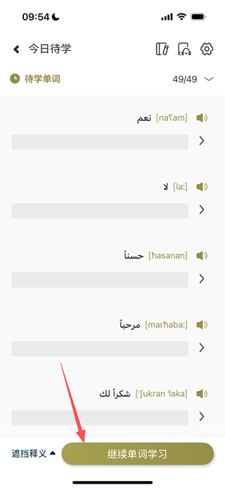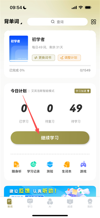 1、在軟件背詞頁面,點擊繼續(xù)學(xué)習(xí)按鈕,進入今日待學(xué)頁面。