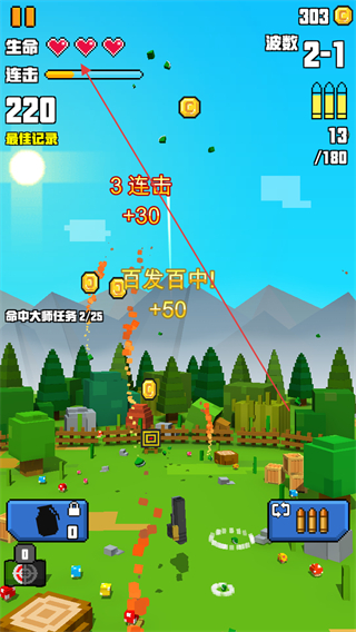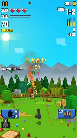 2、持續(xù)射擊目標(biāo),積累連擊數(shù),達(dá)成百發(fā)百中可獲得額外獎勵如+50金幣。