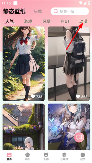 1、在靜態(tài)壁紙頁面,點擊動漫分類標簽,進入動漫類壁紙列表頁面。