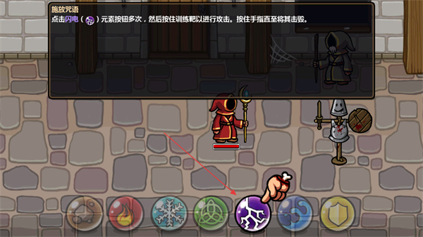 3、以閃電魔法為例,點(diǎn)擊對應(yīng)元素按鈕多次積累能量,再按住訓(xùn)練靶即可持續(xù)釋放魔法直至擊毀目標(biāo)。