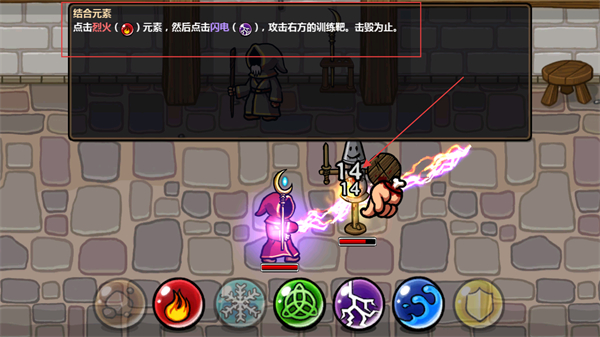 4、可進(jìn)行元素組合,先點(diǎn)擊對應(yīng)元素按鈕,再釋放組合魔法,能對目標(biāo)造成更強(qiáng)力的傷害。