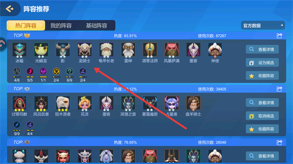 2、在陣容推薦界面中,選擇想要收藏的陣容,如熱門陣容中的某一陣容,點(diǎn)擊查看詳情。