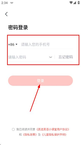 3、在密碼登錄頁面填寫手機號和密碼,勾選相關(guān)協(xié)議后點擊登錄完成賬號登錄操作。