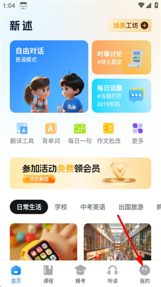 1、在新述口語首頁,點(diǎn)擊底部導(dǎo)航欄的我的選項(xiàng),可進(jìn)入個人中心頁面。