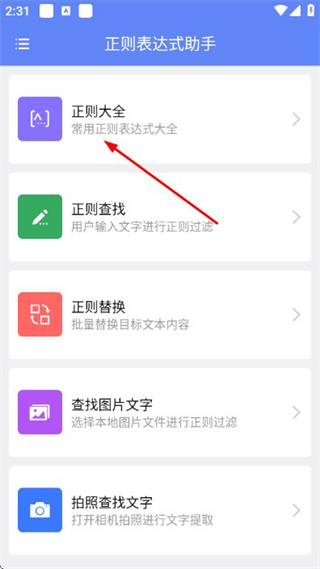 1、在正則表達(dá)式助手頁(yè)面點(diǎn)擊正則大全,進(jìn)入正則表達(dá)式列表頁(yè)面。