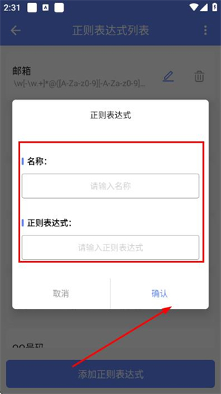 3、在輸入窗口填寫名稱和正則表達(dá)式后,點(diǎn)擊確認(rèn)完成正則表達(dá)式的添加操作。