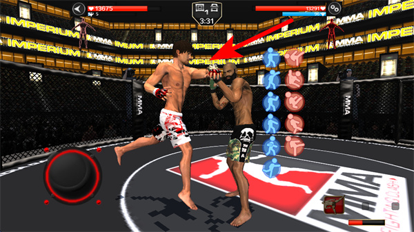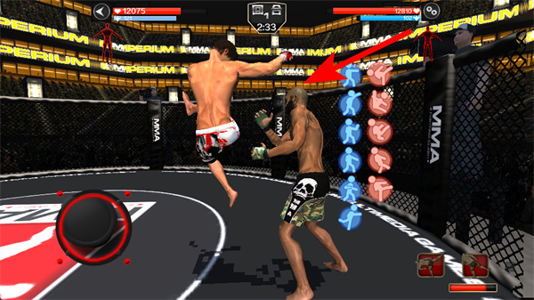 3、緊跟紅色箭頭指引,切換右側(cè)的動(dòng)作按鈕如踢擊,使用不同招式組合攻擊,壓制對(duì)手的有效策略。