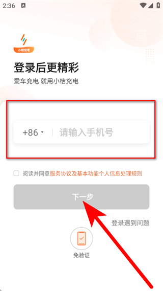 3、在登錄頁面,輸入手機(jī)號(hào),勾選協(xié)議后,點(diǎn)擊下一步。