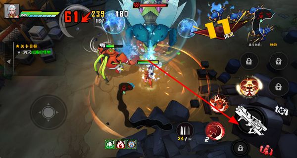 4、根據(jù)關(guān)卡目標(biāo),玩家點擊攻擊和技能按鈕對攔路的怪物發(fā)起攻擊,消滅目標(biāo)怪物,完成關(guān)卡任務(wù)。