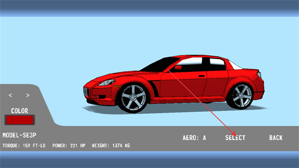 1、在選車(chē)界面選擇紅色SE3P車(chē)型,點(diǎn)擊SELECT進(jìn)入比賽。
