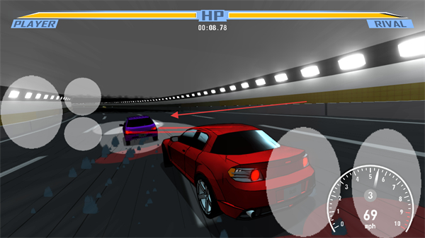 2、操控紅色車(chē)輛,在隧道中追擊紫色對(duì)手車(chē),通過(guò)按鍵調(diào)整方向。