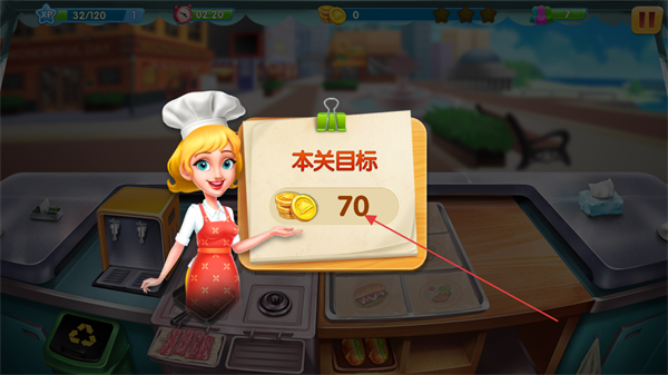 1、明確本關(guān)目標(biāo)收集70金幣,根據(jù)顧客需求如漢堡+飲品,在操作臺制作對應(yīng)食物。