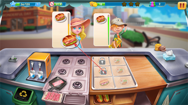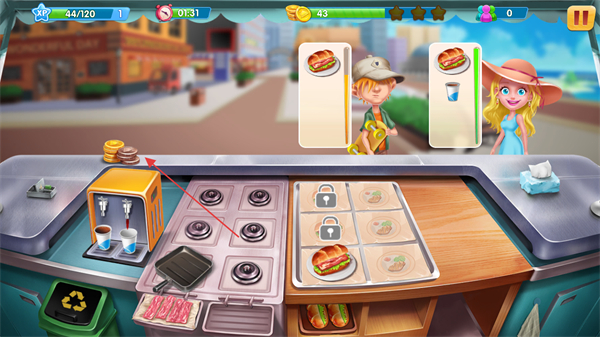 3、持續(xù)接收顧客訂單、制作并交付食物,直到金幣數(shù)量達成目標(biāo)。