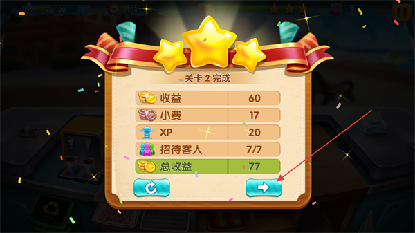 4、關(guān)卡完成后,領(lǐng)取收益、小費等獎勵,點擊箭頭按鈕進入下一關(guān)。