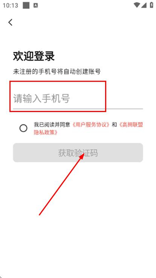 3、在手機(jī)驗(yàn)證登錄頁面填寫手機(jī)號,勾選協(xié)議后,點(diǎn)擊獲取驗(yàn)證碼。