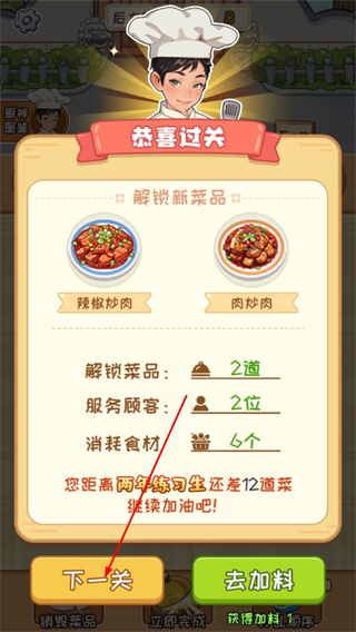 4、通關(guān)后選擇下一關(guān)繼續(xù)挑戰(zhàn),提升食材合成效率,解鎖更多高階菜品。