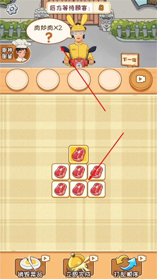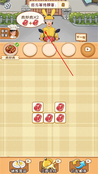 2、在合成界面選擇對(duì)應(yīng)食材,通過(guò)合成相同食材滿(mǎn)足訂單需求,完成菜品制作。