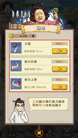 2、點(diǎn)擊底部練功按鈕,進(jìn)入屬性升級(jí)界面,升級(jí)力道耐力等屬性,提升捶打效率。