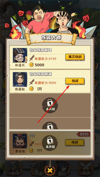 4、點(diǎn)擊底部挑戰(zhàn)按鈕,參與煉器大賽挑戰(zhàn)其他煉器師,獲勝獲取大量金幣。