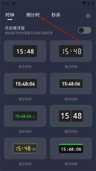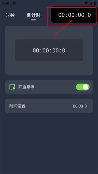 2、在懸浮時鐘頁面,點擊倒計時的標(biāo)簽,切換到倒計時操作界面。