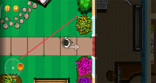 1、在游戲場景中,通過左下角的虛擬搖桿操控角色移動,跟隨箭頭指引的方向前進。